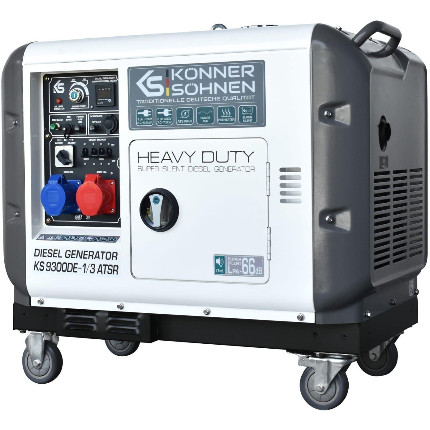 Генератор Синхронный Konner&Sohnen KS 9300DE-1/3 ATSR,230/400В,6.5/6.0кВт,7.5/7.0кВт,1/3Фази, АВР(ATS), електростартер, 168кг / 7000 Вт / Дизель (KS93