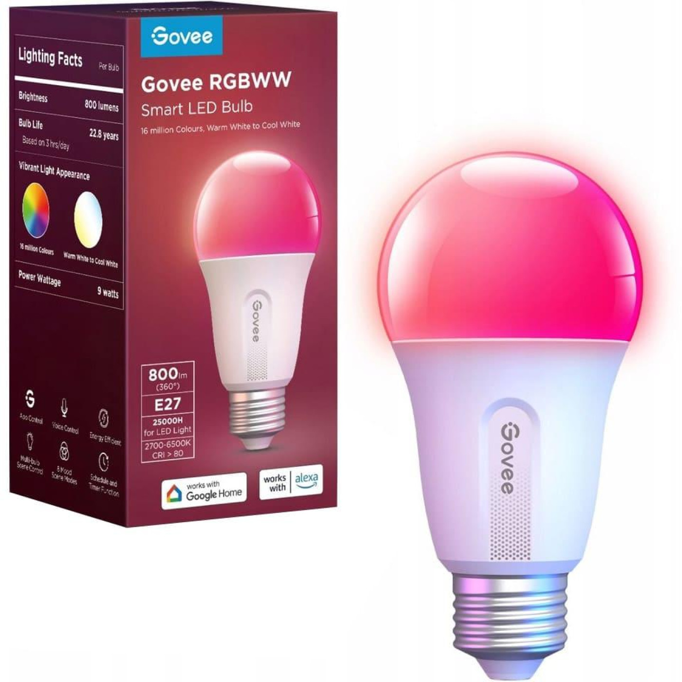 Лампа розумна Govee H6004, E27, 8W, 800Lm, RGB, WI-FI/Bluetooth, билий